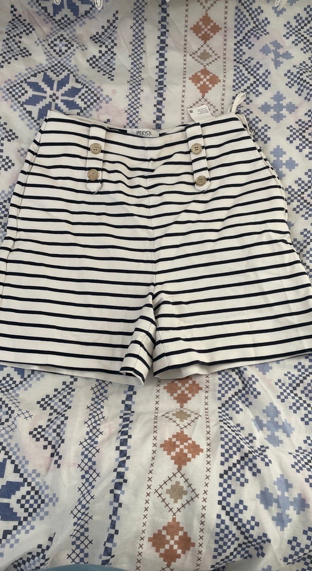 Düğmeli Çizgili Kadın Mini Şort