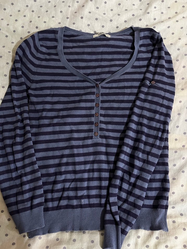 Uzun kollu, düğmeli, bol kesim kadın kazak. Pamuklu, mavi ve gri çizgili, günlük kullanıma uygun.