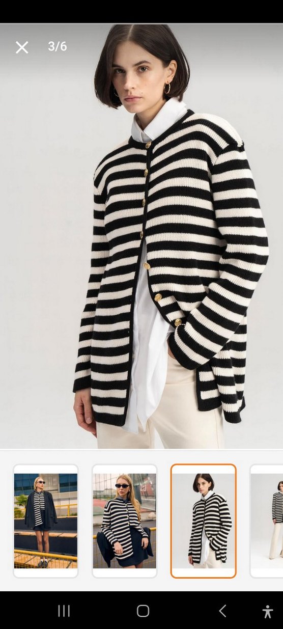 Beyaz-siyah çizgili triko hırka, uzun kollu, yuvarlak yakalı ve düğmeli ön tasarıma sahiptir. Midi boy ve regular fit kesimle günlük kullanıma uygundur.