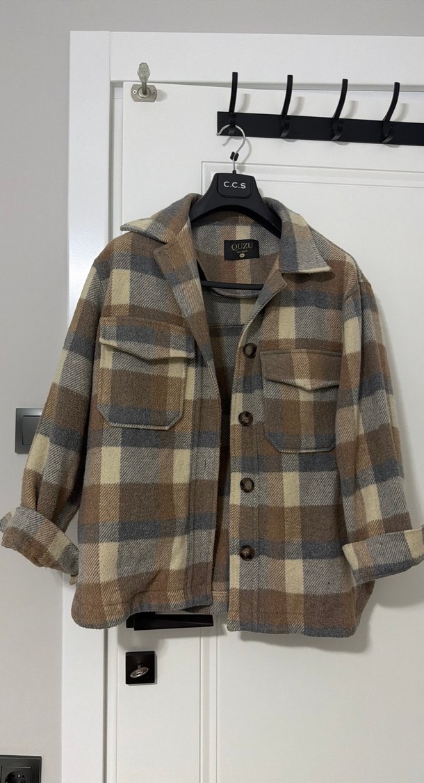 Kadın gömlek, düğmeli, uzun kollu ve geniş kesimdir. Yumuşak yün kumaştan, kahverengi kareli desene sahip, günlük kullanıma uygun rahat sokak stili sunar.