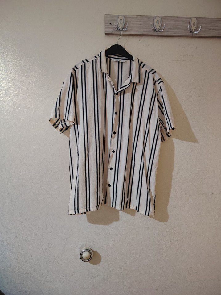 Düğmeli, kısa kollu, yakalı ve bol kesim erkek gömlek. Yumuşak keten kumaştan, beyaz zemin üzerine gri çizgili, günlük rahat kullanım için uygundur.