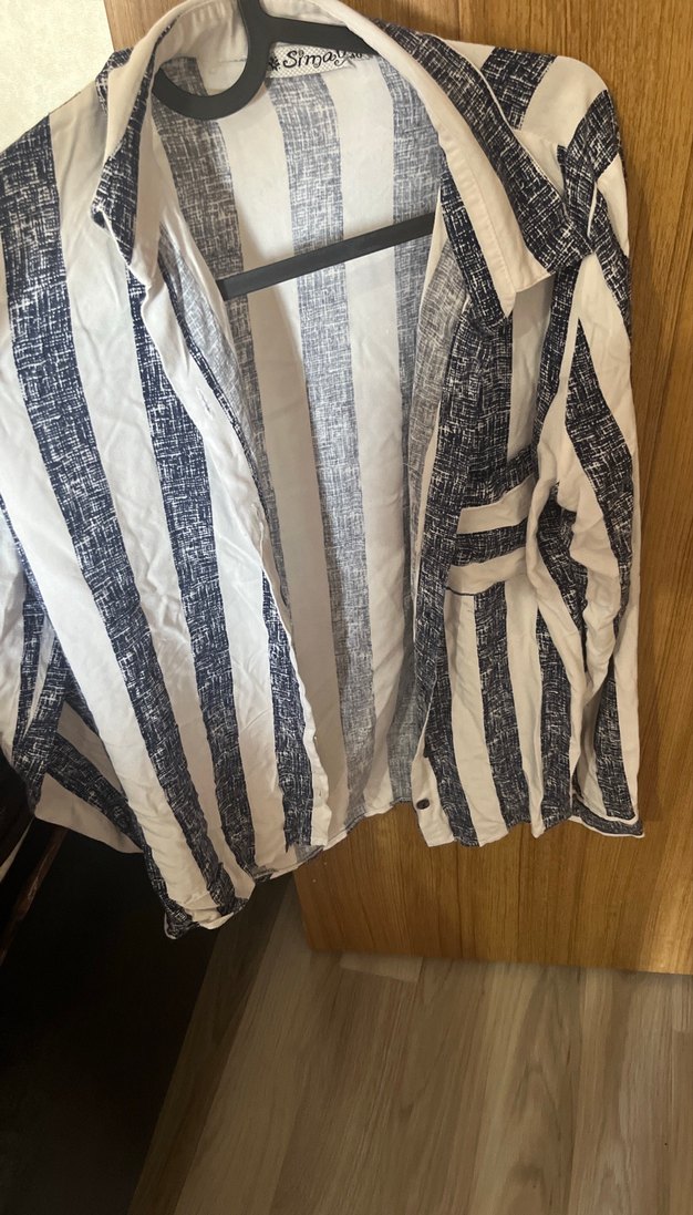 Gri beyaz çizgili keten, uzun kollu, düğmeli, salaş kesim kadın gömlek. Kayık yaka ve normal boyda, günlük sokak stili için uygun.