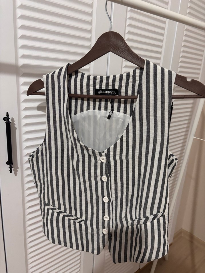 Düğmeli, V yaka, keten kumaştan yapılmış, gri ve beyaz çizgili, kolsuz ve midi uzunlukta, vücuda oturan kadın yelek.