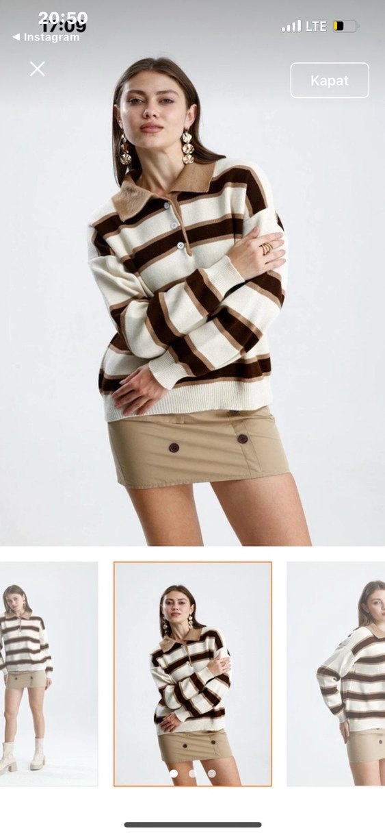 Düğmeli, uzun kollu, çizgili, bej renkli kısa ve bol kesim kadın kazak. Suni kumaştan, günlük sokak stiline uygun.