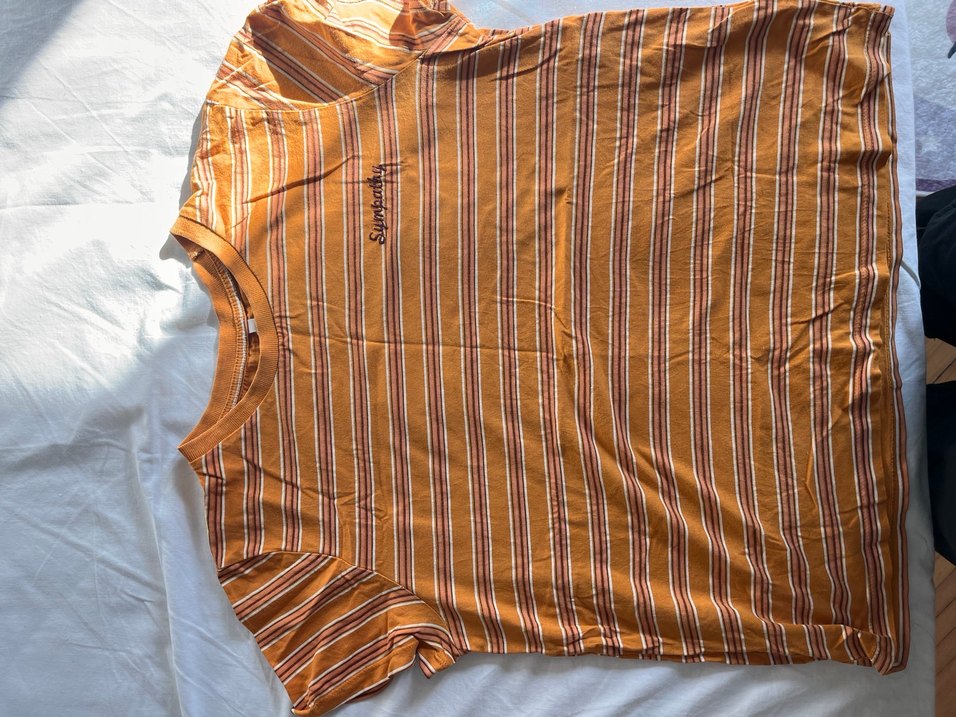 Kısa kollu, tekne yakalı ve bol kesimli kadın tişörtü, parlak kahverengi çizgili desene sahip. Düğme detayları ile günlük rahat stil sunar.