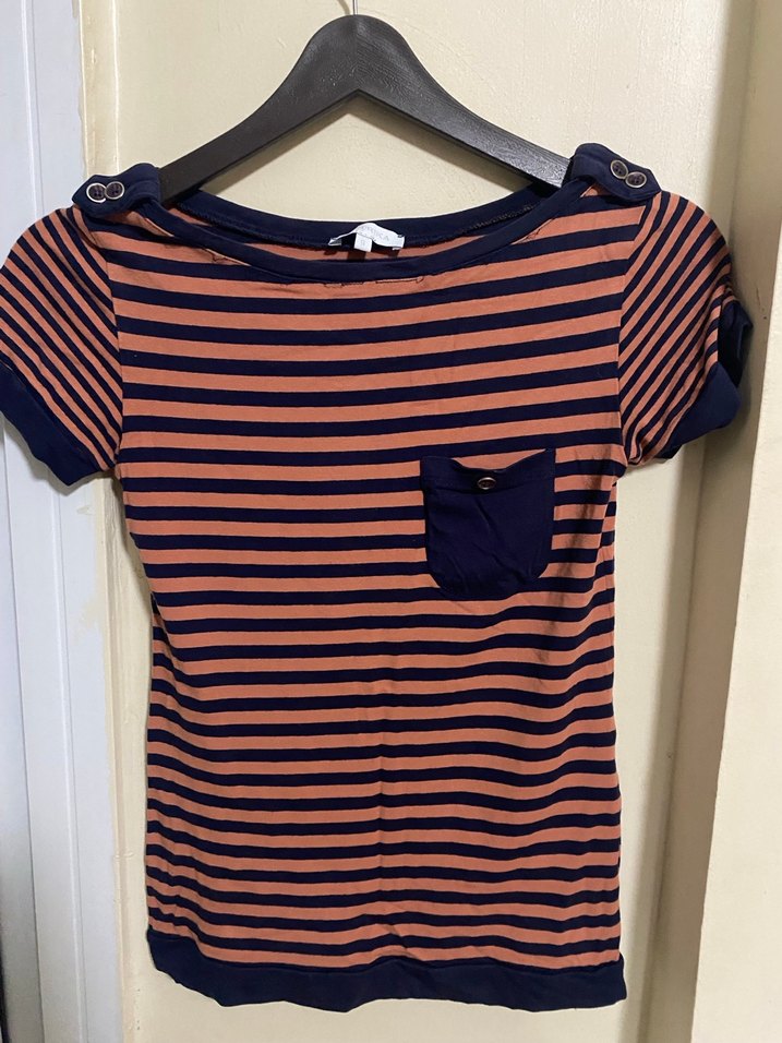 Düğmeli omuz detaylı, kısa kollu, kiremit rengi ve lacivert çizgili, göğüs cepli, normal boyda, dar kesim yumuşak kumaşlı tişört