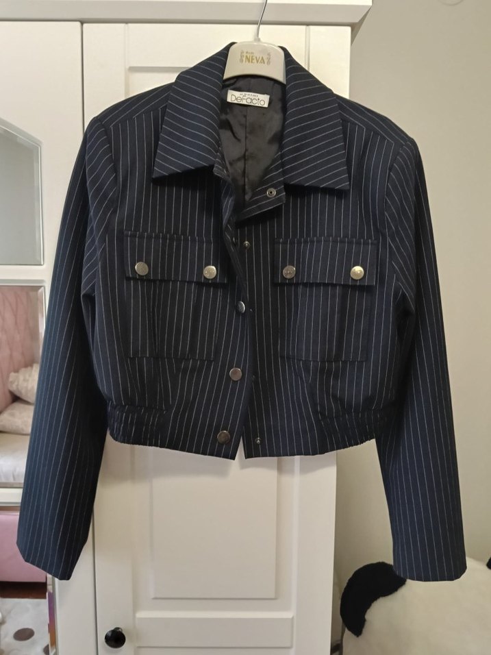 Lacivert çizgili düğmeli, kısa kesim ve regular fit kadın blazer. Uzun kollu, ofis ve günlük kullanıma uygun ceket.