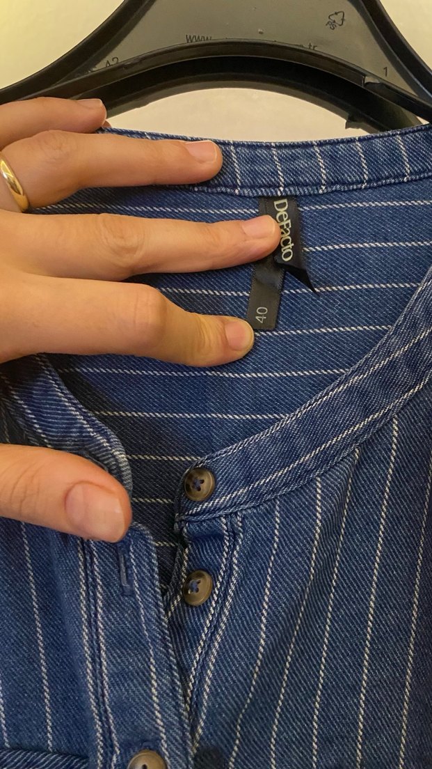 Düğmeli önü ve çentikli yaka detayı olan hamile kot gömlek. Lacivert çizgili denim kumaştan, askılı kolları ve midi boyu ile rahat bir kesime sahiptir.
