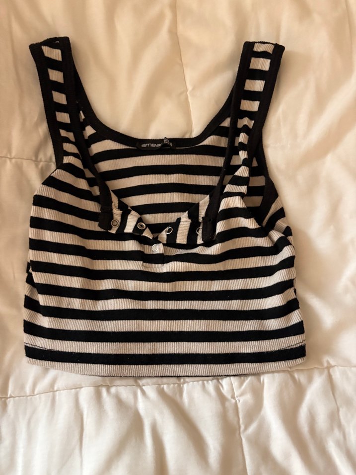 Düğmeli, kayık yaka, krem siyah çizgili, kısa kesim ve vücuda oturan kadın atlet. Yumuşak sentetik kumaştan, gündelik sokak stili için uygun.