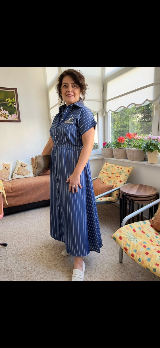 Düğmeli Çizgili Lacivert beymen elbise - Görsel 3