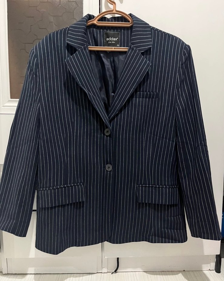Lacivert denim blazer, düğmeli ön ve kesik yaka detaylıdır. Uzun kollu, çizgili desene sahip, midi boy ve regular fit kesimdir. 1 defa giyildi ve yıkandı.Kusursuz bir ürün.Bol geldiği için satışta.Omuzlarında vatka mevcuttur.