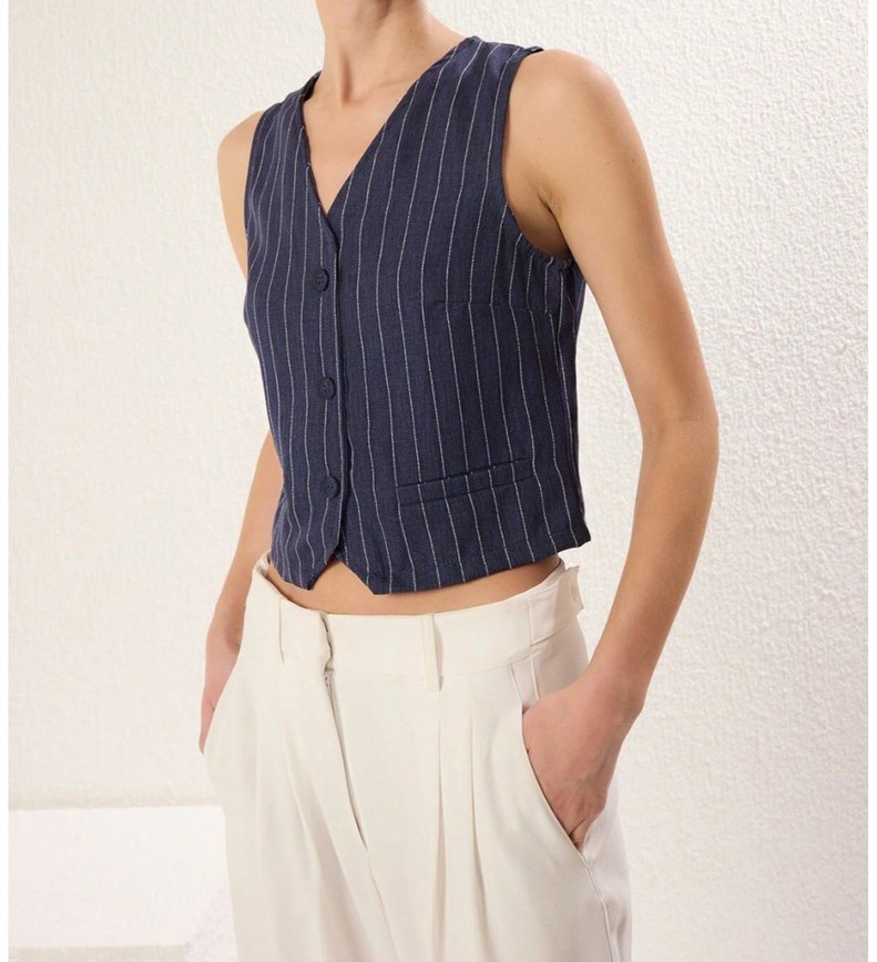 Düğmeli, V yakalı, kısa kesim lacivert çizgili kadın yelek. Sentetik kumaştan, rahat kesim ve mini uzunlukta. Günlük ve ofis kullanımı için uygun.