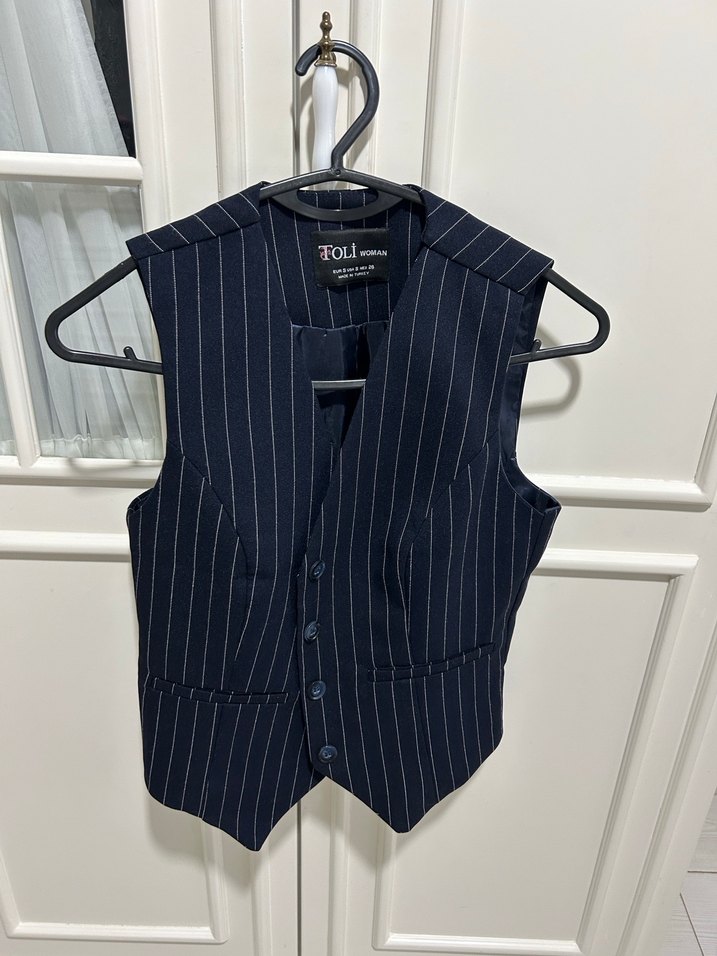 Düğmeli, kolsuz ve çentikli yakalı bu yelek, regular fit kesime sahiptir. Lacivert çizgili denim kumaştan üretilmiştir. Ofis ve günlük kullanıma uygundur. Marka: FOL.