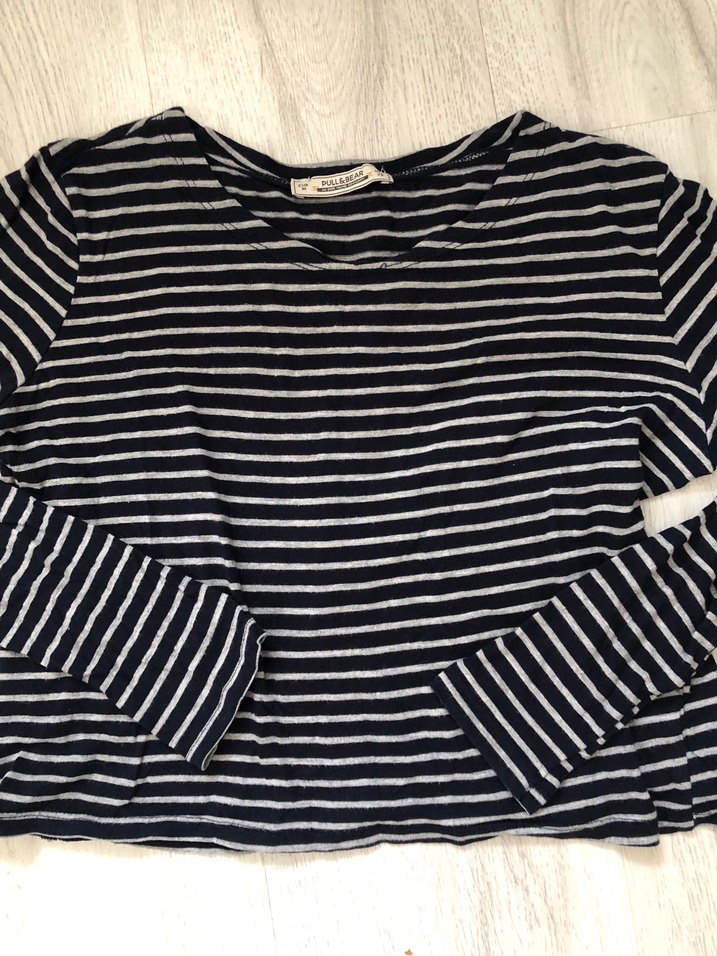 Mavi ve gri çizgili, düğmeli detaylı, uzun kollu ve yuvarlak yakalı bol kesim hamile tişörtü. Yumuşak pamuk kumaştan, günlük rahat kullanım için uygundur.