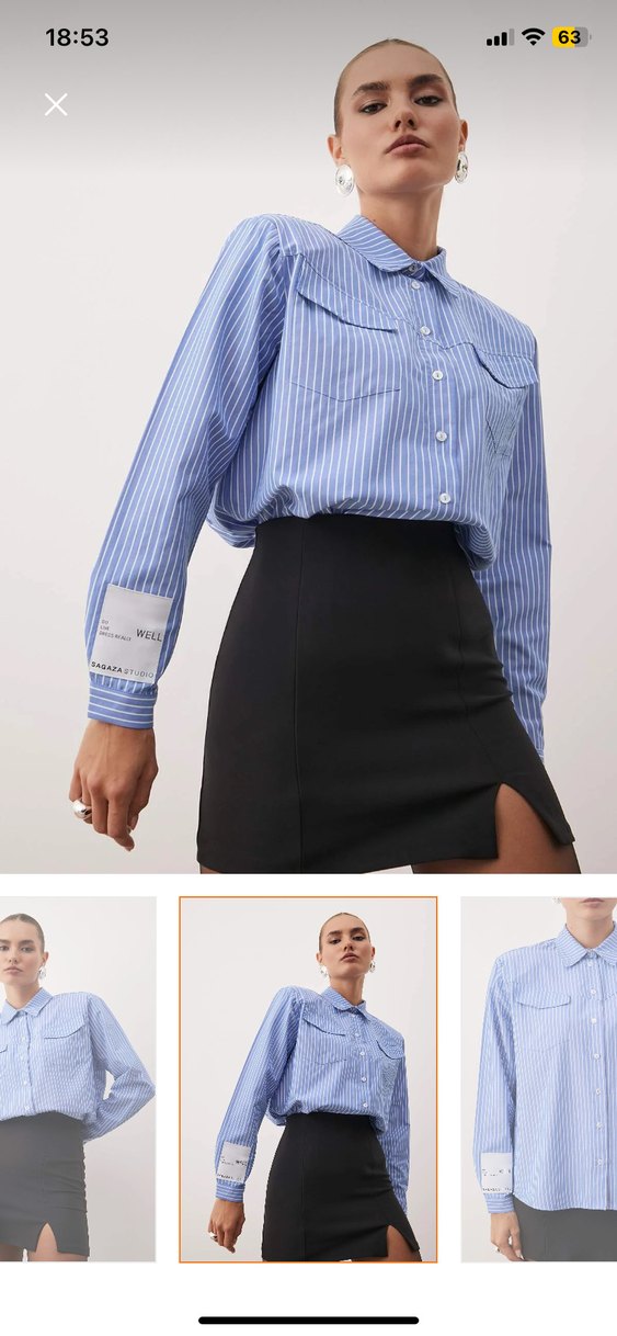 Uzun kollu, düğmeli ve çizgili mavi gömlek. Notlu yaka ve rahat kesimiyle ofis stiline uygun, sentetik kumaştan üretilmiştir.