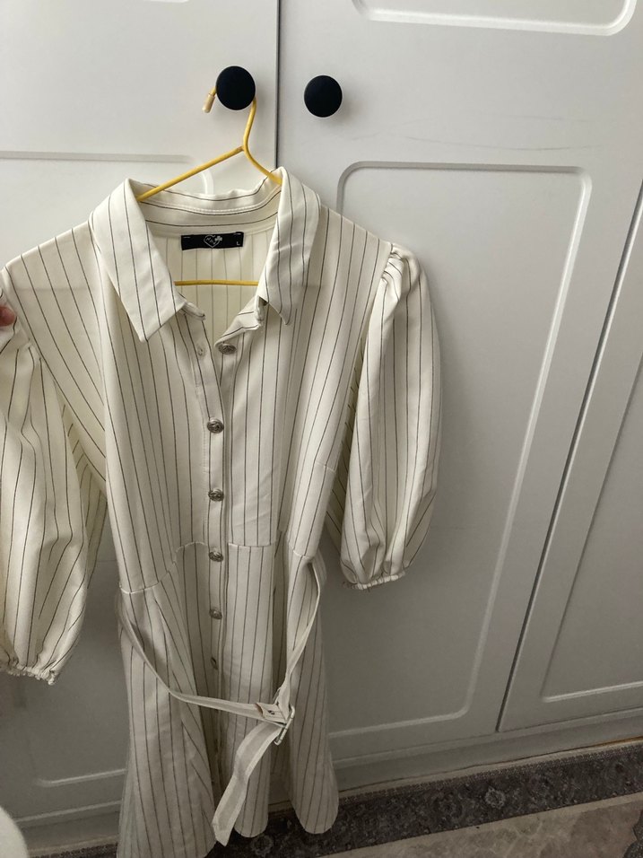 Pamuklu, düğmeli, yakalı ve çizgili beyaz midi elbise. Strappy kollu, regular fit, ofis için uygun şık tasarım. Sadece bir kere giyildi