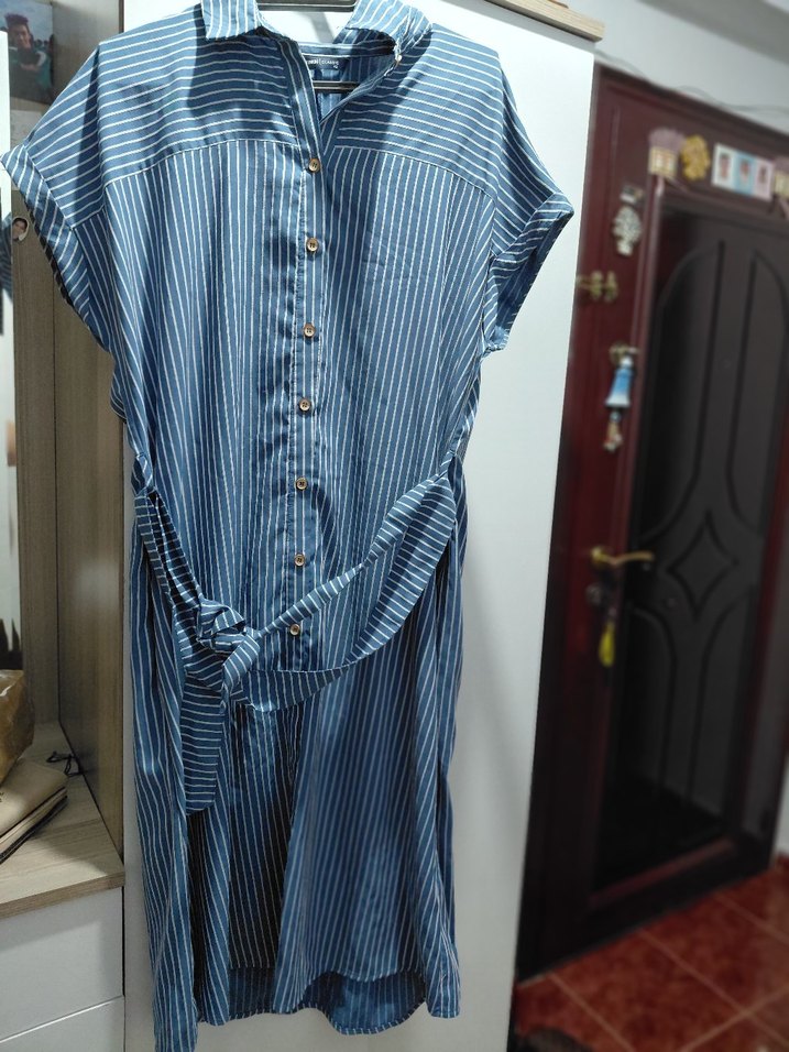 Düğmeli önden kapamalı, kısa kollu, yakalı midi elbise. Mavi ve gri çizgili, rahat kesimli yumuşak kumaştan üretilmiştir.