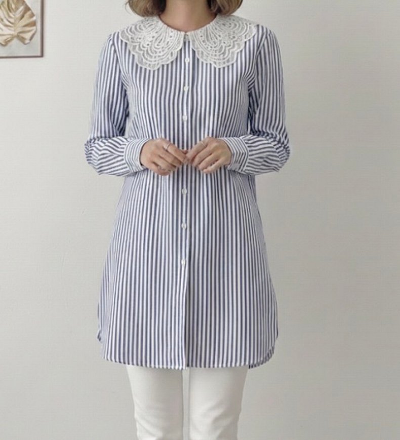Düğmeli, uzun kollu, pamuklu kumaştan yapılmış, gri ve beyaz çizgili, yakalı midi kadın gömlek.