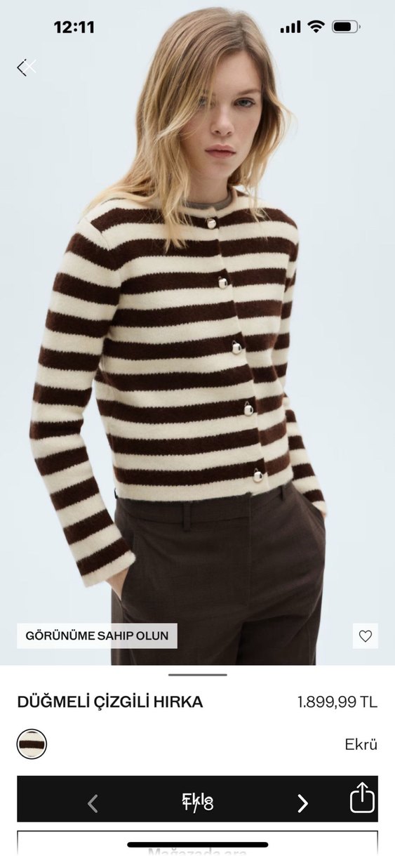 Bu kahverengi çizgili yün hırka, yuvarlak yaka ve uzun kolludur. Orta uzunlukta, düğmeli ve rahat kesimdir. Günlük sokak tarzı için uygundur. Üzerinde "GORONOME SAHIP OLUN" yazısı bulunur.
