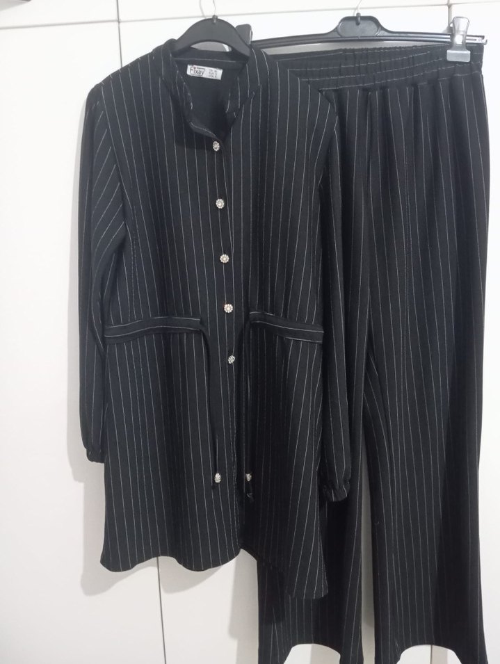 Uzun, düğmeli, kesimli yakalı siyah çizgili kadın takımı, yumuşak sentetik kumaştan üretilmiştir. Ofis kullanımı için uygundur.