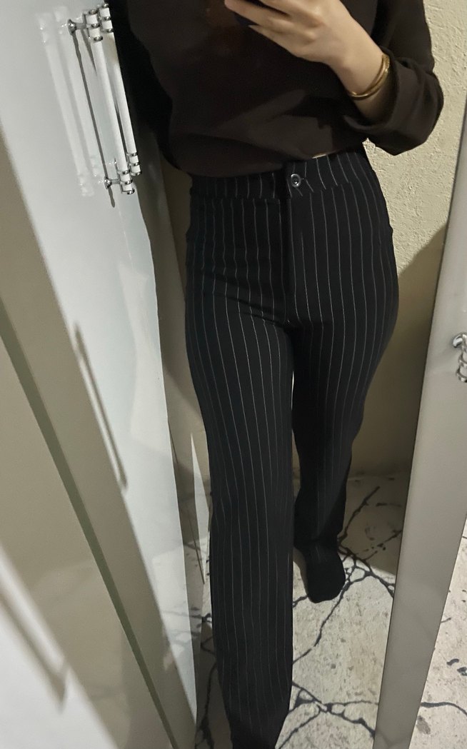 Düğmeli ve çizgili siyah kumaş pantolon, normal boy ve regular fit. Ofis ve günlük kullanıma uygun, sentetik ve rahat dokulu kumaştan.