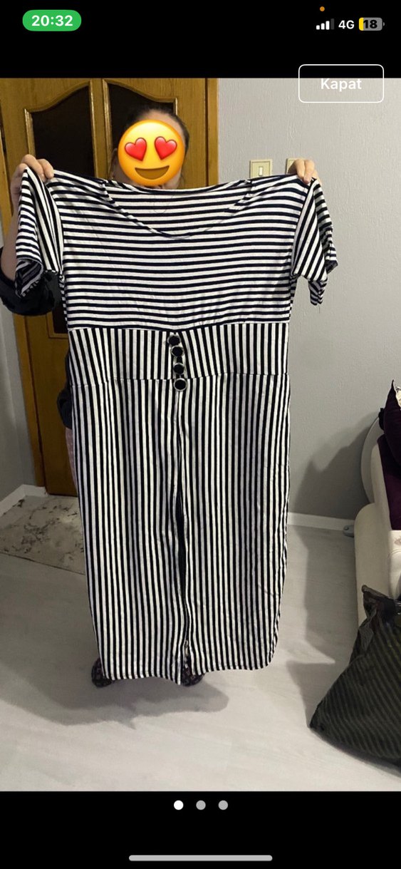 Düğmeli ve kısa kollu, çizgili tulumu. Tekne yaka ve sentetik kumaştan, günlük kullanıma uygun şık bir parça.