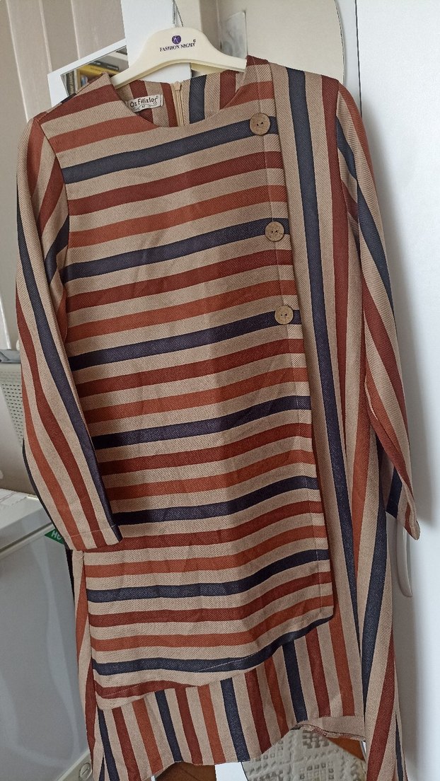 Düğmeli, uzun tunik regular fit, kesik yaka ile. Yumuşak sentetik kumaştan, kahverengi, gri ve pas çizgili desende, günlük kullanıma uygun Paris normcore tarzı.