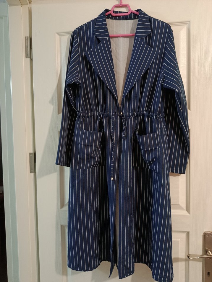 Düğmeli Çizgili Uzun Denim Ceket