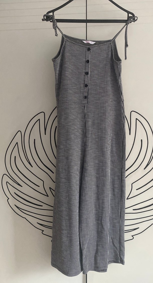 Pamuk kumaştan, düğmeli ön ve straplez yakalı gri renkli, çizgili, kolsuz kadın tulumu. Günlük kullanıma uygun, regular fit kesim.