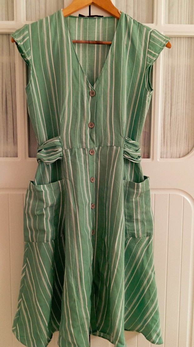 Açık yeşil çizgili keten, kolsuz, düğmeli, V yakalı, bol kesim uzun elbise. Büyük cepleri ve bohem vintage tarzı bulunur.omuzdan boy 95 bel 37 kol altı en 45cm.yeni temiz
