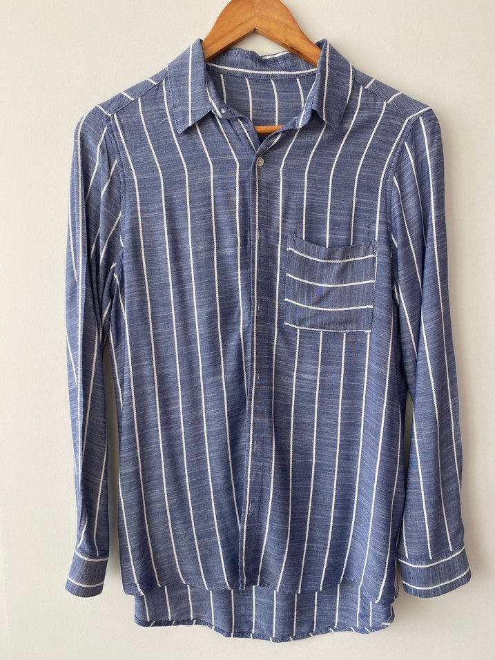 Mavi çizgili denim gömlek, uzun kollu, düğmeli ve yakalıdır. Salaş kesimiyle rahat bir görünüm sunar.