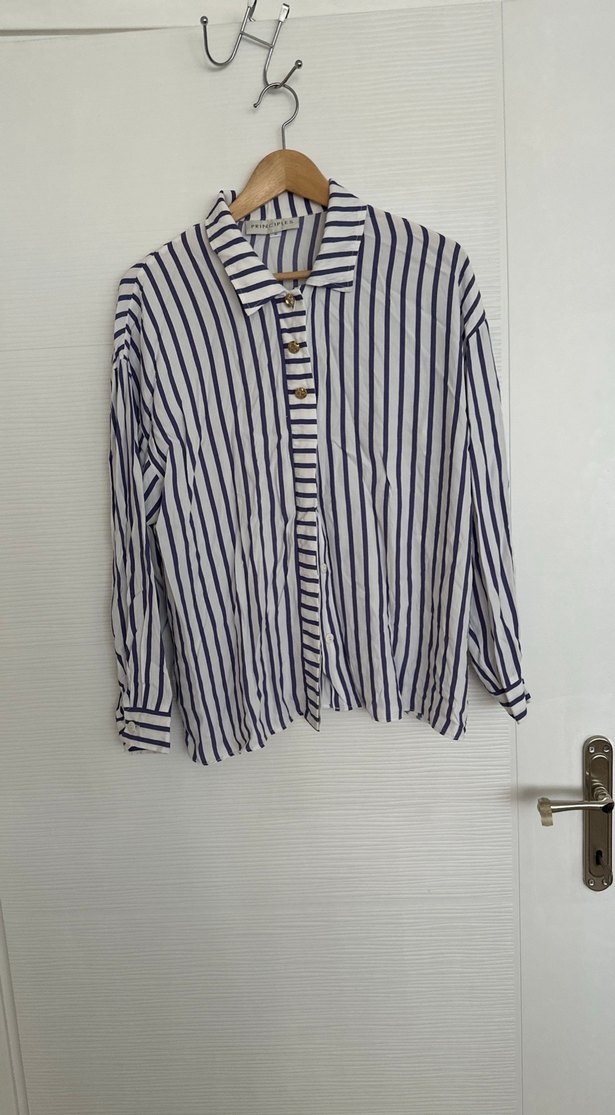 Düğmeli, uzun kollu ve yakalı keten gömlek, beyaz zemin üzerinde koyu çizgili desenli. Gevşek kesimi ve Paris sokak modasına uygun tarzıyla günlük kullanıma uygun.