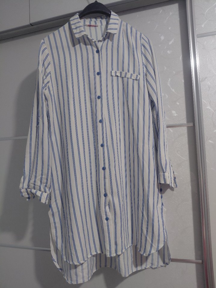 Nefes alabilen keten kumaştan, düğmeli, uzun kollu, yakalı ve çizgili beyaz-mavi midi gömlek. Rahat kesimiyle günlük sokak modasına uygundur. yeni