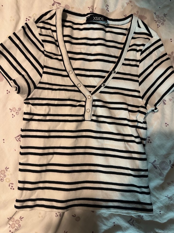 Pamuk kumaştan, kısa kollu ve düğmeli V yaka kadın tişörtü. Siyah ve beyaz çizgili, normal uzunlukta ve dar kesim, günlük sokak stili için uygundur.
