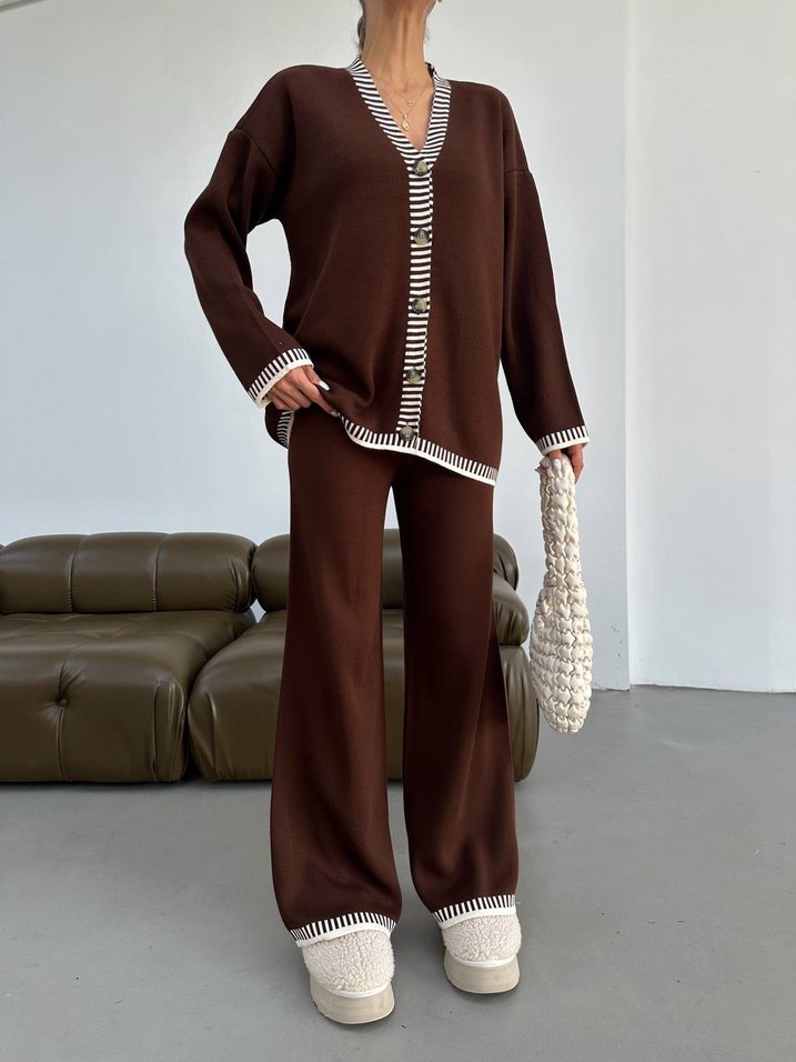 Düğmeli Çizgili V Yaka Kahverengi Kadın Triko Takım