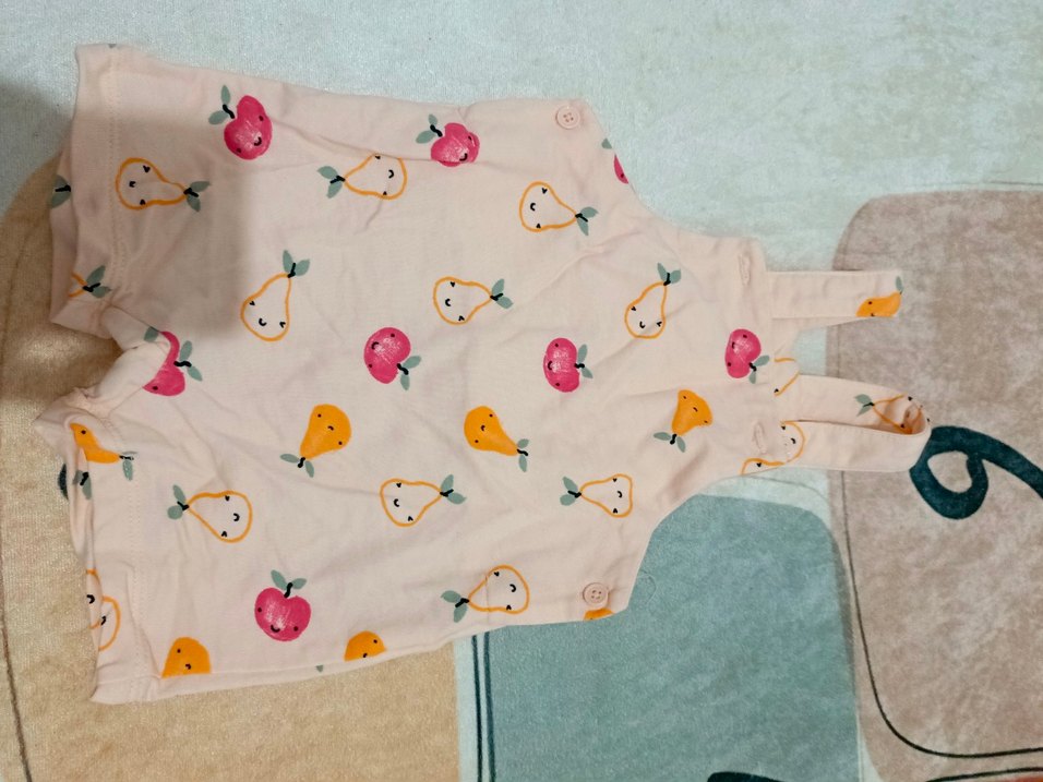 Pastel renkli, meyve desenli ve düğmeli bebek kız tulumu. Yumuşak ve rahat kumaştan üretilmiştir.