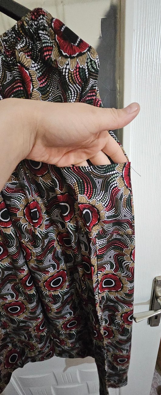 Düğmeli, çok renkli desenli sentetik kumaştan, bohem tarzda, bol kesim hamile midi eteği.