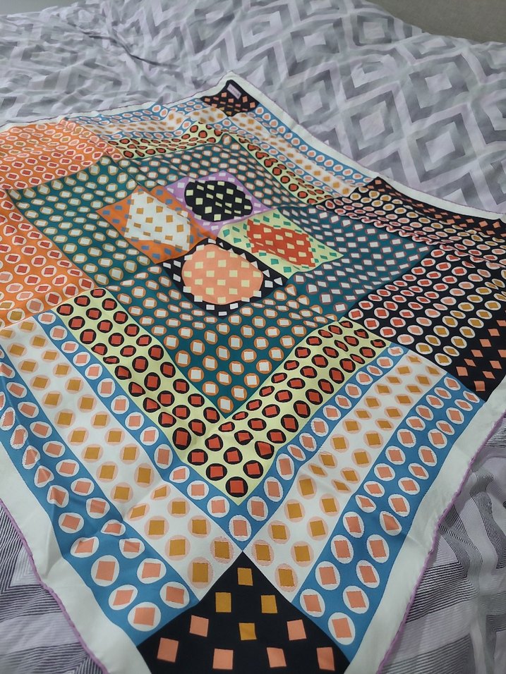 Düğmeli, çok renkli pastel desenli bohem kadın fularıdır. Yumuşak tekstil malzemeden yapılmıştır ve hippie, retro tarzını yansıtır.