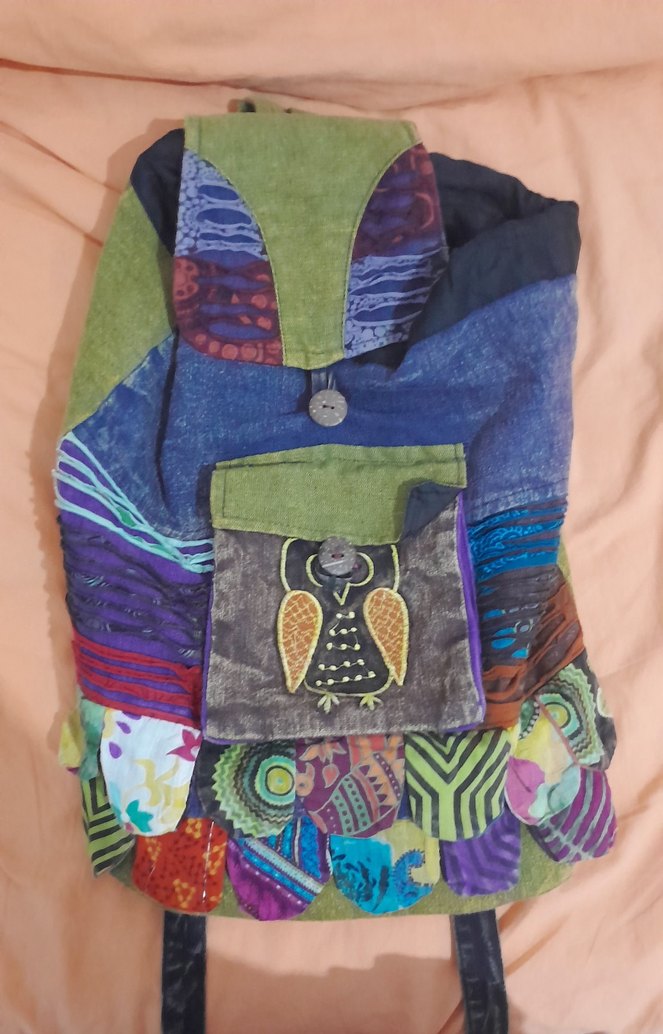 Kadın sırt çantası, çok renkli dokuma kumaş ve bohem desenlerle tasarlanmıştır. Düğmeli kapak ve işlemeli ön cep bulunur. Günlük kullanım için uygundur.