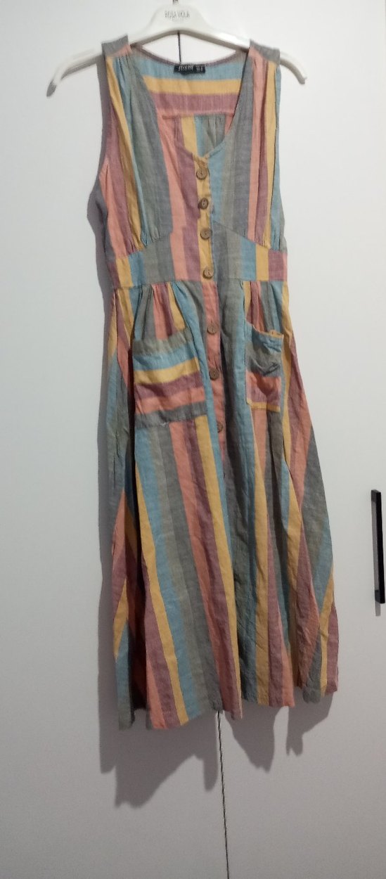 Düğmeli ön kısmı ve bağlamalı pastel çizgileri olan, yumuşak keten kumaştan yapılmış, bol kesim, askısız uzun elbise. Bohem tarz için uygun.