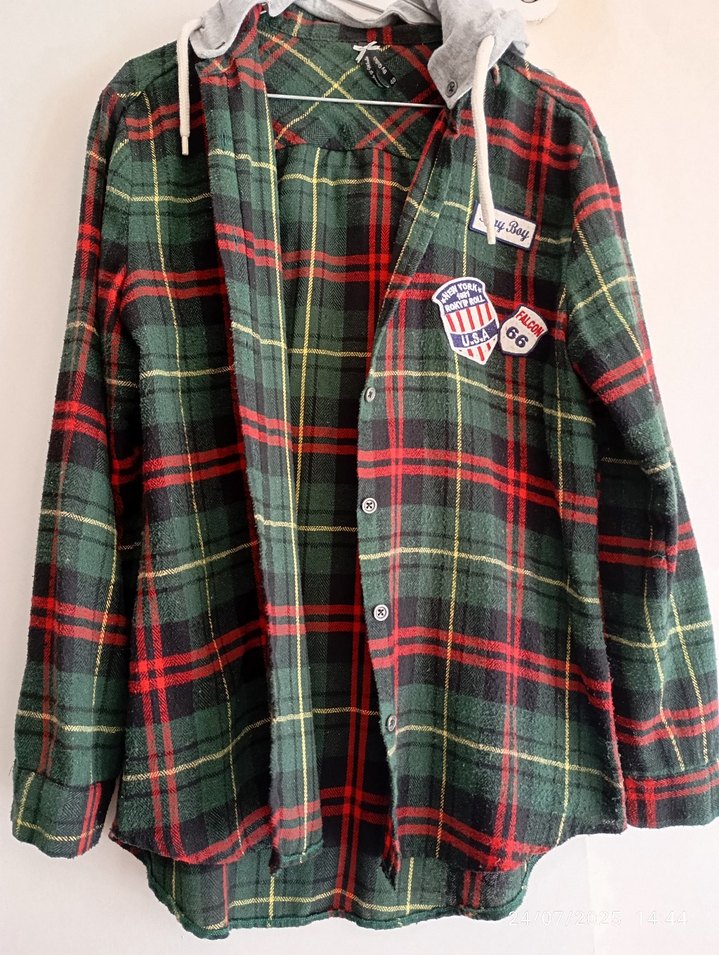 Düğmeli, uzun kollu ve bol kesim çok renkli ekose desenli gömlek. Notch yaka ve kapüşonlu, baskılı detaylarla sokak tarzı ve rahat bir seçenek.