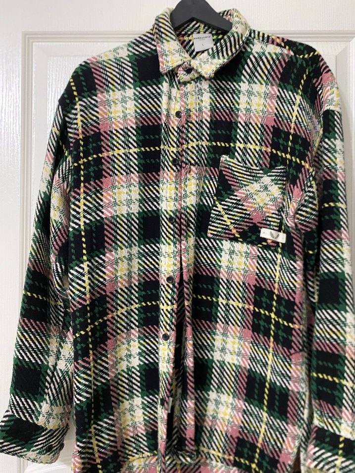 Düğmeli ön cep ve uzun kollu, yumuşak sentetik kumaştan çok renkli kareli desenli, salaş kesim kadın gömlek.