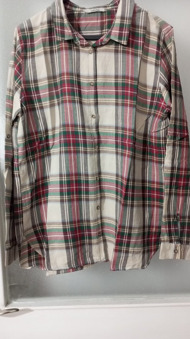 Çok renkli kareli desenli, düğmeli, yakalı, keten kumaştan, bol kesim, uzun kollu kadın gömleği. Günlük ve rahat sokak stiline uygun.