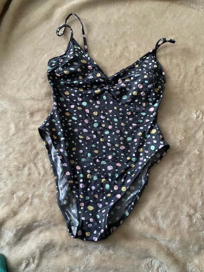 Düğmeli, ince askılı, çok renkli koyu tie-dye desenli kadın mayo, plaj kullanımı için uygundur. ️