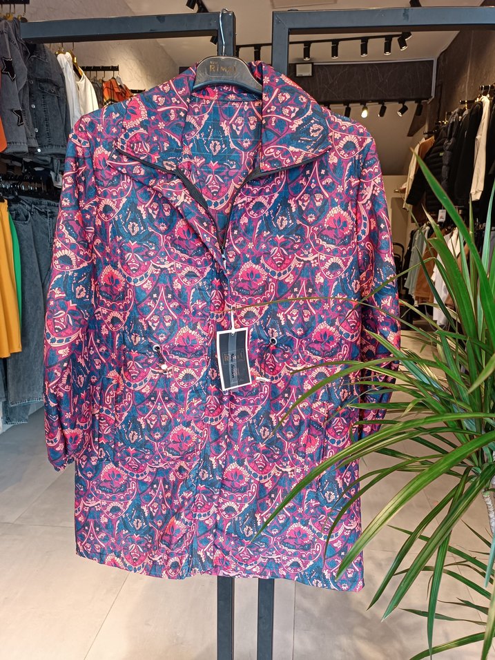 Bohem tarzı, çok renkli bağlama desenli, düğmeli, uzun kollu, normal uzunlukta kadın yağmurluğu. Rahat kesim ve yaka detaylı. M bedenden 2xl bedenine kadar mevcut ‼️
