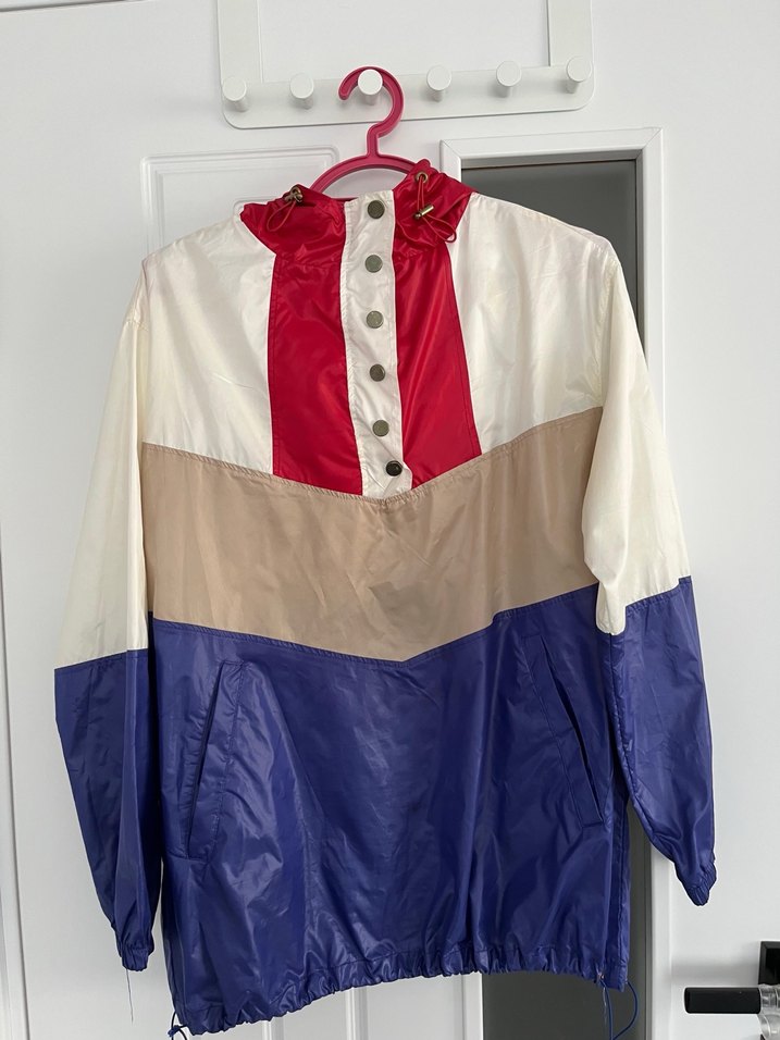 Erkekler için çok renkli, düğmeli, normal midi boyda, bol kesim, uzun kollu, parlak sentetik kumaştan rüzgarlık. Dış mekan kullanımı için uygundur. ️