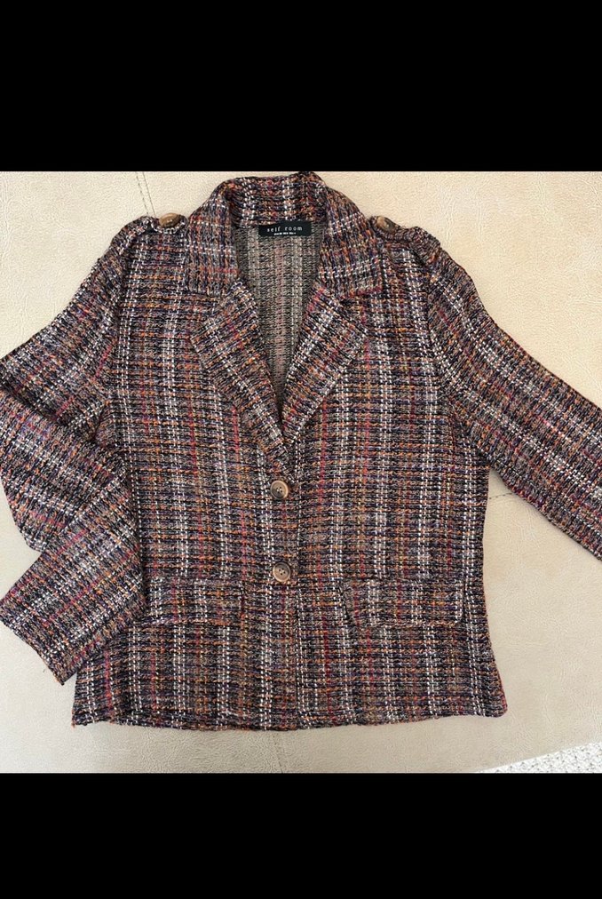 Düğmeli ve kesik yakalı, çok renkli sentetik kumaştan kadın blazer. Uzun kollu, kısa ve regular fit, ofis için uygun, Paris sokak tarzı etkisiyle. Marka temsilidir.