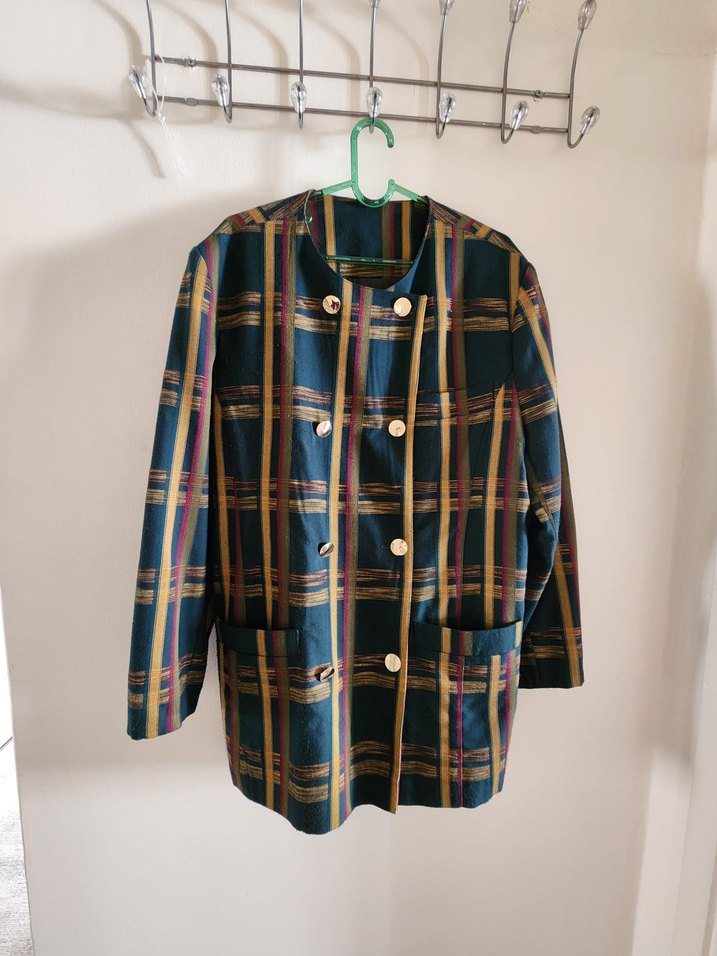 Düğmeli ön cep ve kesik yaka detaylı, uzun kollu midi boy çok renkli ceket. Günlük kullanım için uygun, rahat kesim ve koyu tonlarda desenli.