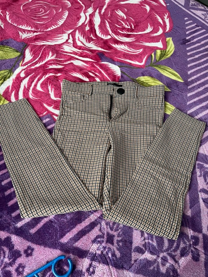 Düğmeli, regular fit çok renkli kumaş pantolon. Midi boy, rahat ve günlük sokak stili için uygun. Sorunsuz