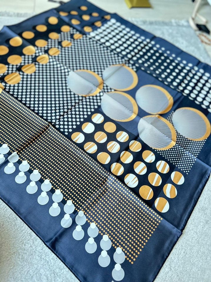 Düğmeli tasarıma sahip, gri tonlarında çok renkli desenli modern kadın fularıdır. Avant-garde tarzı yansıtır.